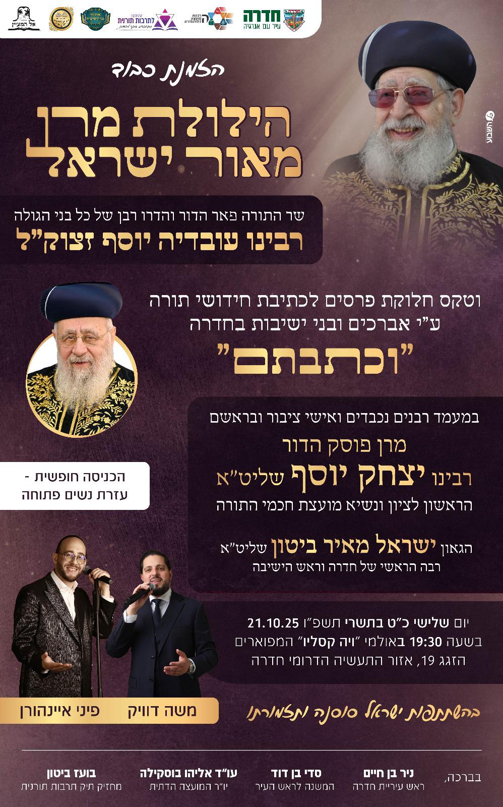 במעמד מורנו ורבינו מרן הראש"ל רבי יצחק יוסף שליט"א, ומרנו ורבינו הגאון רבי ישראל מאיר ביטון שליט"א רבה הראשי לחדרה, ורבני העיר.
